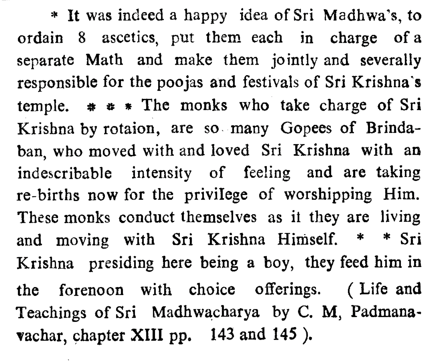As per your wishes, I am sending a picture of Śrī Madhva Muni and one of Śrī Uḍupī Kṛṣṇa along with this letter. Many of the ekadaṇḍī-yati-gaṇa [single-staff sannyāsīs] who are the heads of the eight maṭhas there worship in gopī-veśa; I have collected a picture of that as well. I have also included a copy of one mention of this topic.1