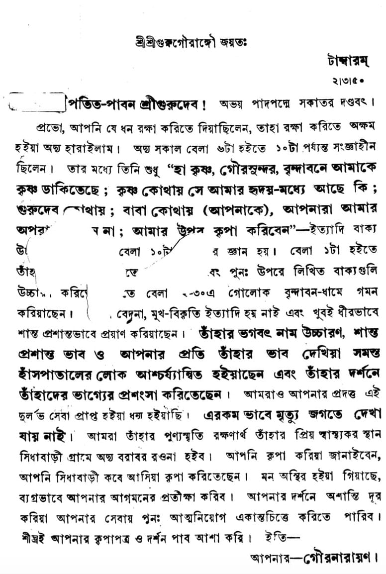 O Prabhu! That most precious treasure you entrusted to me to protect, I was incapable of protecting, for today I have lost him. This morning, from 6 till 10 o’clock, he was without outer awareness. In that condition, he was saying, “Hā Kṛṣṇa, hā Gaurasundara! Kṛṣṇa is calling me to Vṛndāvana! Where is Kṛṣṇa!? Is He in my heart? Where is Gurudeva, where is Bābā (father)? Please disregard any of my offences to you! Please bestow your mercy upon me!” At 10 o’clock he came back into external consciousness, but from 1:00 p.m. onward, his pulse again started to drop, and again he started calling out the same words mentioned above. Then, at 2:30 p.m., he departed for Goloka Vṛndāvana Dhāma. He did not experience any pain, his face did not distort in the slightest or anything like that, and he departed in a completely peaceful, serene manner. The hospital staff were wonderstruck to see his chanting of Bhagavān’s holy names, his peaceful state of mind and his feelings for you, and they praised their own fortune for having had the darśana of such a personality. We too are blessed to have received this rare service from you. Deaths like this are simply not seen in this world. To honor his auspicious memory, we will at once depart for Siddhābāḍī-grāma, his favourite health resort. Kindly inform us when you will mercifully come to Siddhābāḍī. Our minds are now restless, and we anxiously await your arrival. Upon receiving your darśana, we will be able to do away with our unease and be able to resume our one-pointed, dedicated service to you. We hope to quickly receive your merciful reply and your darśana. Thus—