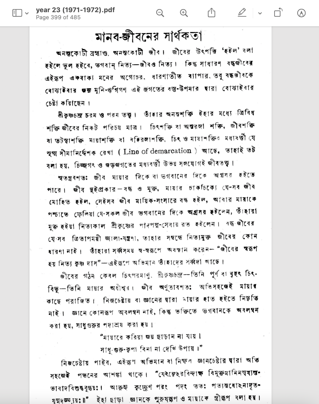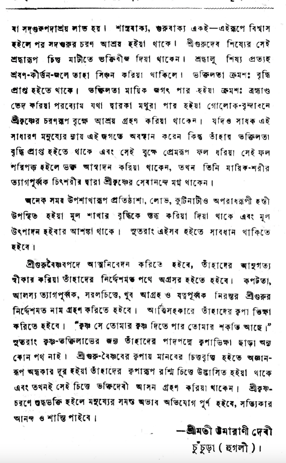 One must surrender one’s soul at the feet of Śrī Guru and the Vaiṣṇavas. One has to accept their guidance and advance along the path as per their instructions. Giving up deceit and laziness, with a simple heart, great enthusiasm and endeavour, one must chant nāma as per Śrī Guru’s instructions. With anguish and longing, one must beg for their mercy. “Kṛṣṇa se tomāra kṛṣṇa dite pāro tomāra śakati āche | – Kṛṣṇa is yours; you have the power to give Kṛṣṇa.” Thus there is no other way to attain bhakti for Kṛṣṇa than to beg at their feet for their mercy. By the mercy of Śrī Guru and the Vaiṣṇavas, the darkness of ignorance will be dispelled from the human being’s heart, the rays of their mercy will flood his consciousness, and then only will Bhakti Devī, the Goddess of Devotion, assume her seat therein. If one develops pure devotion for Śrī Kṛṣṇa, then all the scarcities and struggles of human life will be fulfilled and one will obtain true bliss and peace.