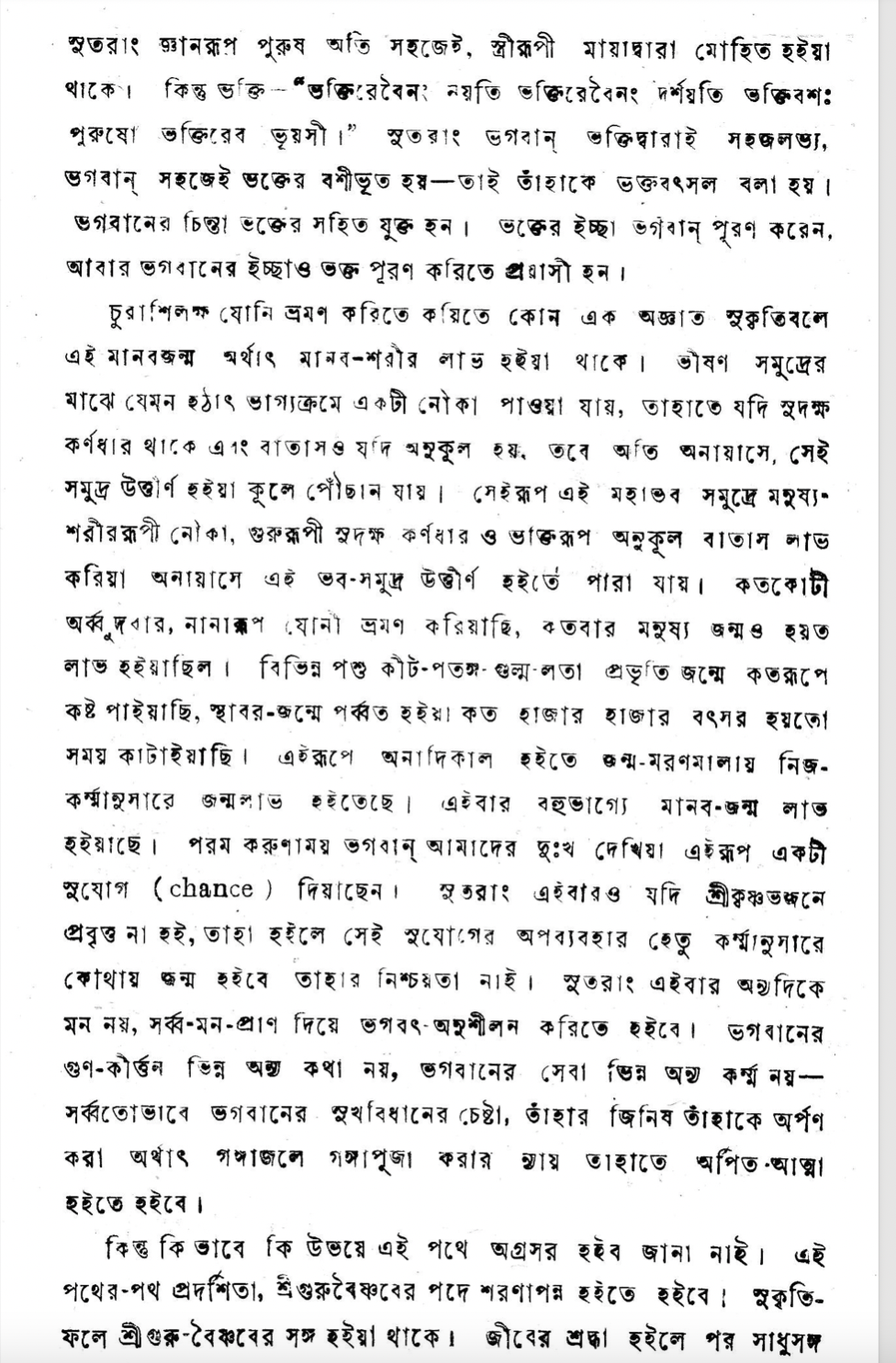 After roaming and roaming through eight million four hundred thousand species of life, by dint of some unknown sukṛti (devotional merit), one attains this human birth, this human body. If in the midst of the ocean one were to fortuitously chance upon a boat and the boat had an expert captain and the winds were favourable, then one could easily cross that ocean and reach its shore. Similarly, if in this great ocean of material existence one obtains the boat of the human body, the expert captain that is guru, and the favourable winds of bhakti, one can easily cross over this ocean of material existence. For how many tens of millions of births have we explored various species of life? How many times have we already had human birth? Just think of all the suffering we have faced as animals, insects, worms, plants, creepers, etc. Perhaps we have been immobile species too, like mountains, spending thousands and thousands of years like that. Thus, since time immemorial, we have been taking birth according to the fruits of our actions in this cycle of birth and death. This time, by great fortune, we have attained human birth. Supremely merciful Bhagavān has seen our suffering and given us this one happy chance. Therefore, if this time also we do not start performing bhajana of Śrī Kṛṣṇa, there is no knowing where we might be born according to our karma for having misused this opportunity. Therefore, this time, with our mind not in any other direction, we must give all our mind and soul to bhagavat-anuśīlana. No other kathā except for Bhagavān’s guṇa-kīrtana, no other activity except for Bhagavān’s service—striving to please Bhagavān in every regard, offering Him what is His, like worshipping the Ganges with Ganges water, we will have to offer our souls unto Him.